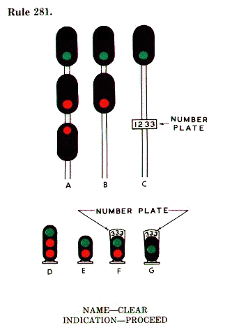 Note: This diagram is based on partial information. While the color positions are correct, the actual number of lights on each signal and their color order is not known. Diagram shows typical C&O number and order. Any information on RF&P signals would be appreciated.